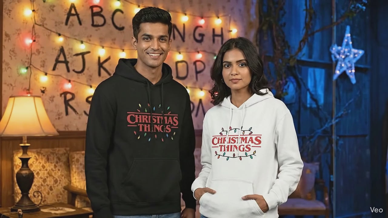 Our Christmas Things Hoodie blends festive Christmas vibes with retro supernatural aesthetics — complete with classic string lights and bold graphic design. Soft, cozy, and perfect for winter gifting.